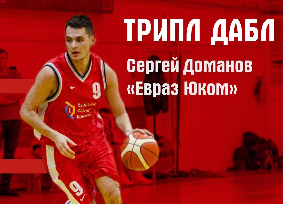 Игрок команды «Евраз Юком» Сергей Доманов в домашнем матче регулярного чемпионата Екатеринбурга с «Районом» (105:71) оформил первый трипл-дабл в сезоне из 14 очков, 12 подборов и 14 результативных передач.